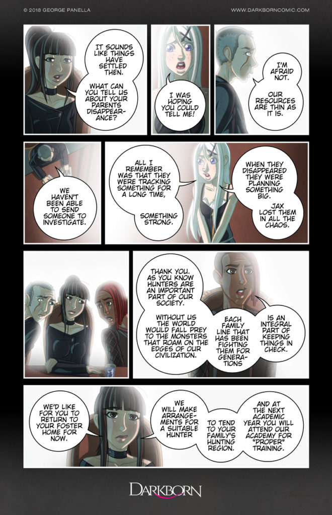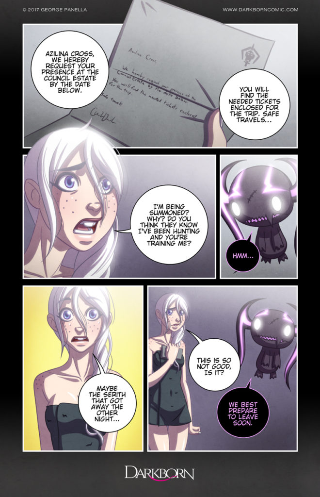 What a way to start a day. Azia has been summoned by the Council! Jax doesn’t seem at all surprised. Did he see this coming? What will happen to Azia now? The future is uncertain. Be sure to vote for Darkborn on TopWebComics and help the comic grow! Follow me on Twitter and Tumblr for… Continue reading Verdict